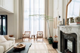 以奶油色为基调,挑高的客厅开阔大气。一整面落地窗带来通透的采光,阳光透过纱帘洒入,多了几分朦胧感
