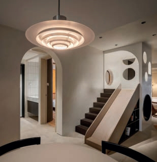 客厅中的滑梯装置,外形如乳酪般布满圆洞的镂空设计,留给了孩子无尽的探索空间。下方的格子用于储物,收纳绘本和玩具