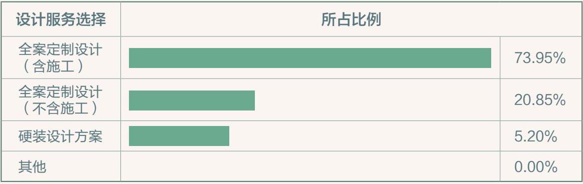 在装修、设计服务的选择上,超过七成业主选择包含施工的全案定制设计,这说明越来越多的装修用户愿意为设计付费。受时间和精力的限制,人们也更愿意享受全包式服务带来的省心、省时、省力的效果,因此个性化、定制化的一站式全案定制设计在消费升级的浪潮下备受追捧。