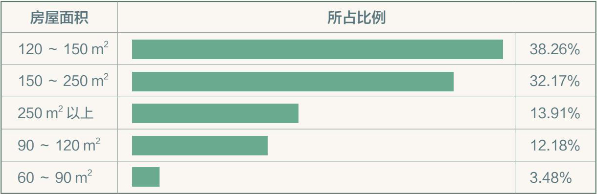 在本次调研中,房屋面积在120m 2 以上和大平层的户型为主流趋势。集功能“扁平化”、生活“私密化”、室内空间“家庭化”优势于一体的大平层住宅,能够在一个扁平空间里集合家居生活的所有功能,最大化提高空间利用率,给居住者带来全方位的享受。在具备开放性的同时,又能保障家庭成员各自活动的私密性,家装设计受限少,为设计带来无限可能。