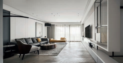 黑白灰极简的空间中跃出一抹明晰的黄色,随着阳光逐渐洒落,室内愈发清简而开阔