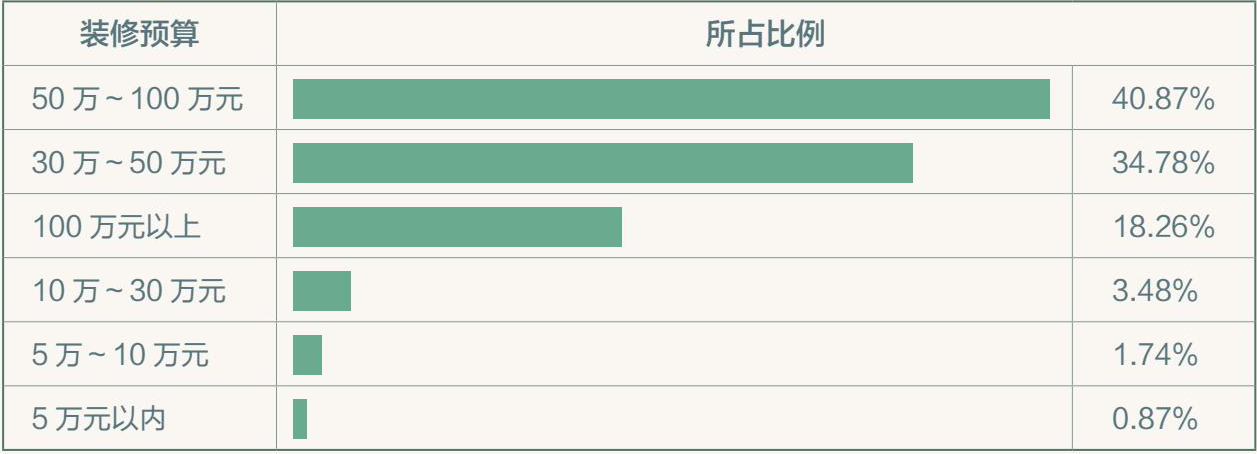 调研显示,“80后”是装修的主流人群,占64.35%;“90后”作为家装市场的新势力,则占29.57%。“80后”和“90后”人群构成了新消费主义时代下的社会中坚力量,他们崇尚精致与品质,追求更高的生活质量,同时也具有良好的经济条件来满足对品质生活的追求。从装修预算上看,六成业主的装修预算在50万元以上。越来越多的年轻人愿意为了提升生活品质去好好设计、装修自己的家,他们希望家能够更好地满足各种生活需求,并为家人带来美好的生活体验。