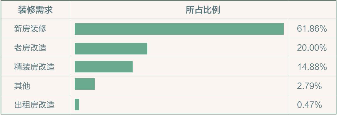 随着中国城市化进程持续加深,购置新房进行装修的人群仍处于家装市场的主力地位,在本次调研中占比61.86%。近几年来随着国家精装房政策的推广,不少一线、二线城市精装房普及率逐步提高,因此也催生了越来越多的精装房改造需求,但其并未真正占据主流市场,占比14.88%。