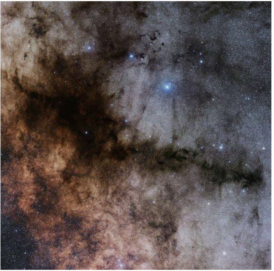 黑色天空为幕,点点银河是宇宙的奇观之一。看到银河系在头顶延伸总是能让我产生一种巨大的眩晕感和渺小感——管窥宇宙规模诚然感到难以置信,但是,任何看过银河的人都会知道,它不是跨越天空的光道,而是光与暗交织在一起,有一条将银河系纵向劈开的阴影深渊。银河仿佛断成了两块锯齿状的区域,中间隔着一段墨黑隔阂。历史常为天文研究提供宝贵材料,让我们了解古人是如何通过诗意想象和神话来解释这一现象的。中美洲的玛雅人相信,我们银河系中的黑暗是通往“恐怖之地”(Xibalba,玛雅人的地狱)的入口。古希腊神话略微乐观一些,讲述了赫利俄斯(Helios)的儿子法厄同(Phaethon)乘着太阳神战车在天空中兜风,横冲直撞出一片黑暗。