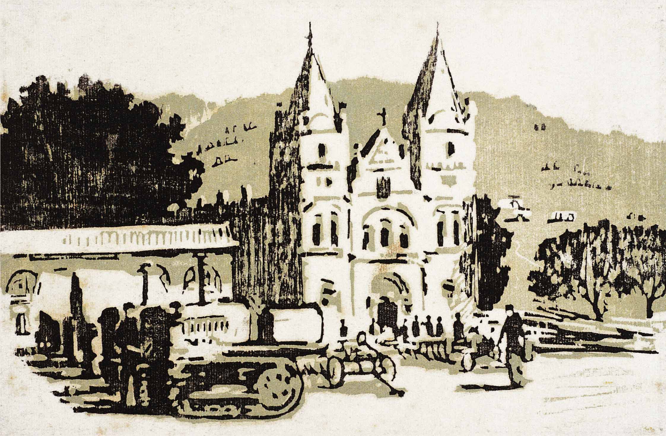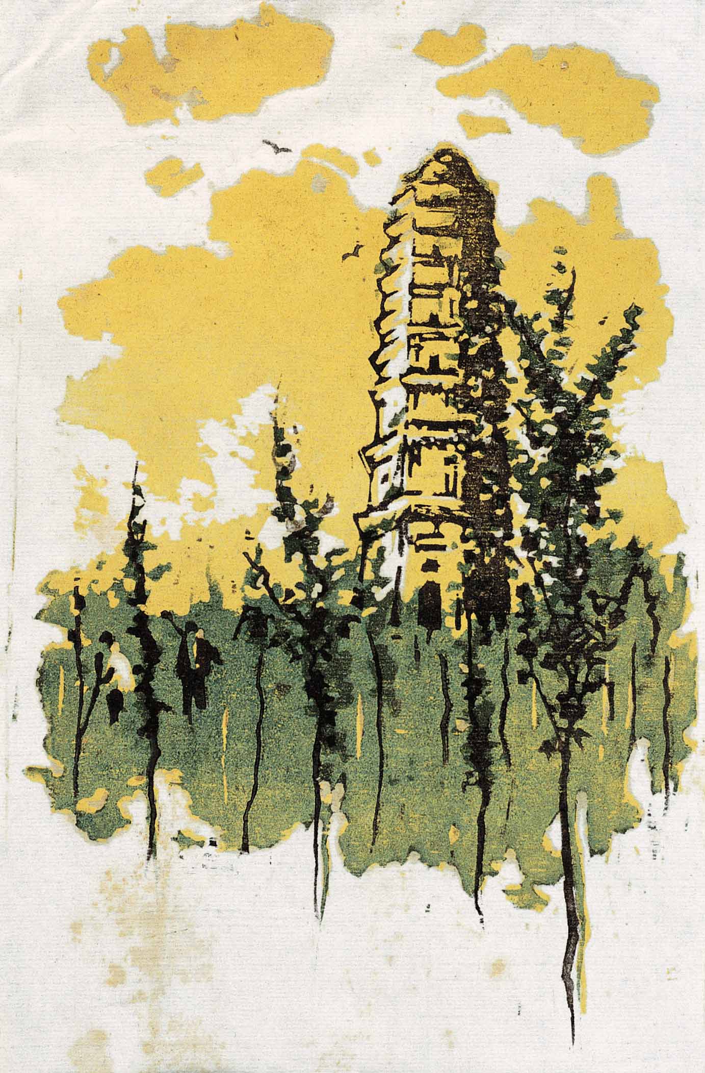 |延安组画:延安宝塔|1956年|木版油印套色|12cm×19.7cm|