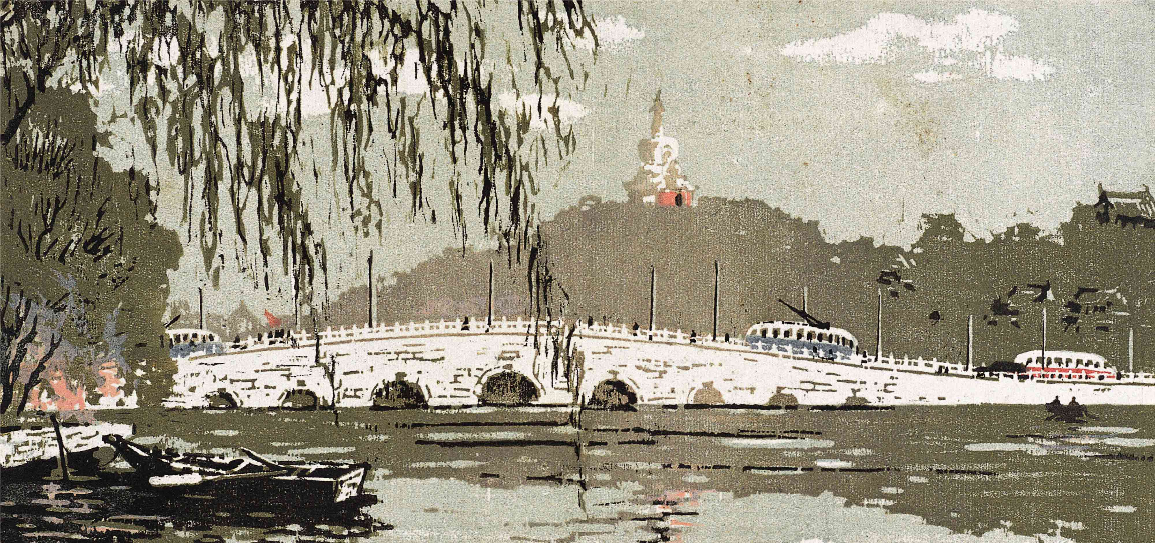 我拿了一封出版社的介绍信,骑着自行车,带了水彩工具,跑到中南海后门,很容易就进到了中南海里面,在湖边找了个地方,对着北海方向画了一幅水彩画。桃红柳绿,白塔白桥,水中倒影,桥上来往着无轨电车,充分表现了北京的春天景象。事后经过加工设计,分色刻版,完成了一幅油印套色木刻,叫《春日》,不但出版了独幅画,北京各杂志也争着发表。对这张作品,我自己也比较满意。而且套色印刷技术也有了进步。可以说《春日》是中国第一幅表现北京春天的套色木刻作品。