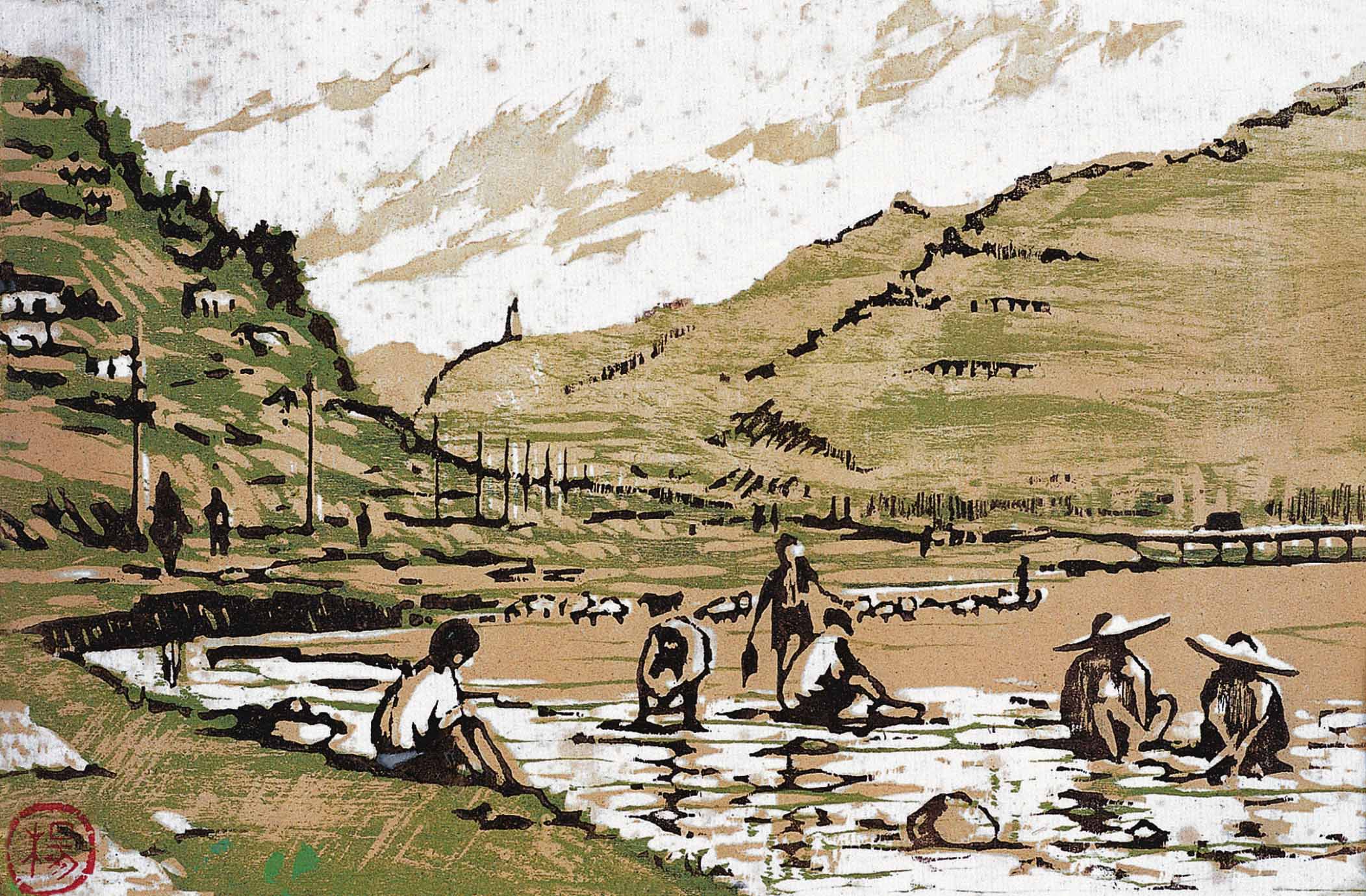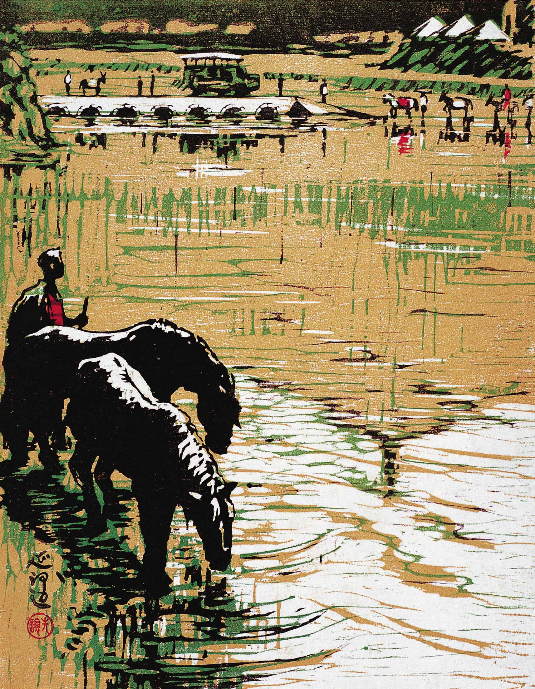 |延安组画:延河边|1956年|木版油印套色|26.5cm×20cm|