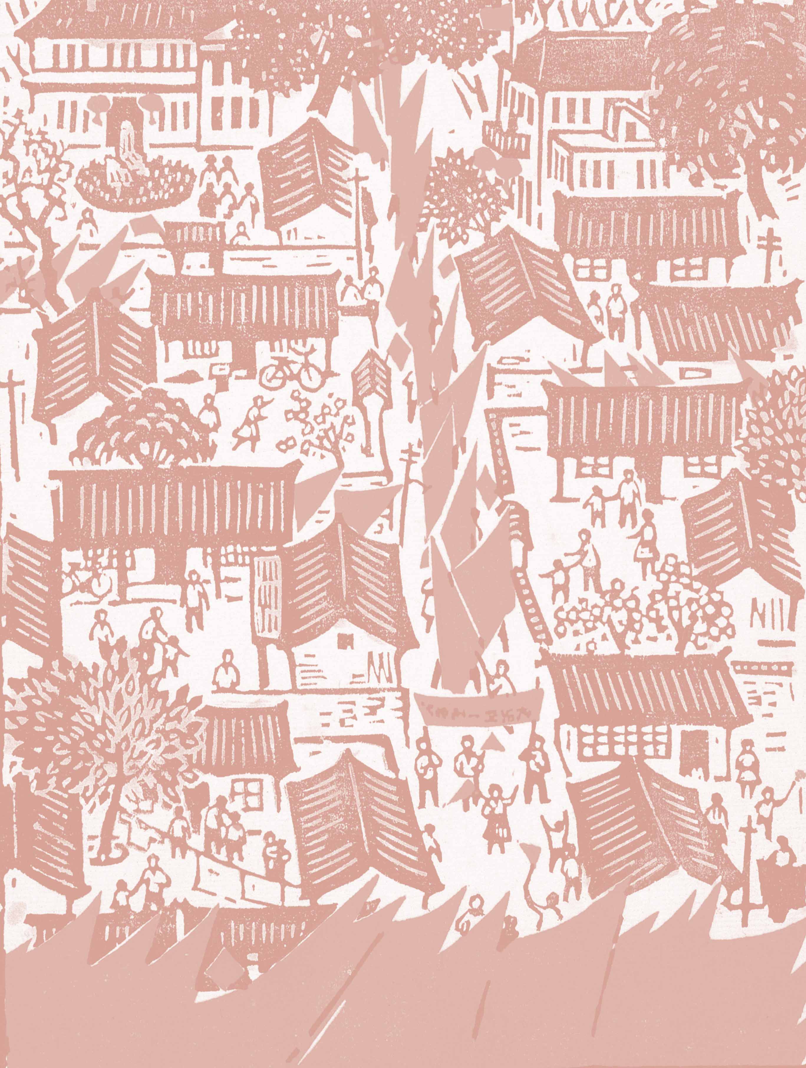 |延安组画:杨家岭|1956年|木版油印套色|14.2cm×25.5cm|