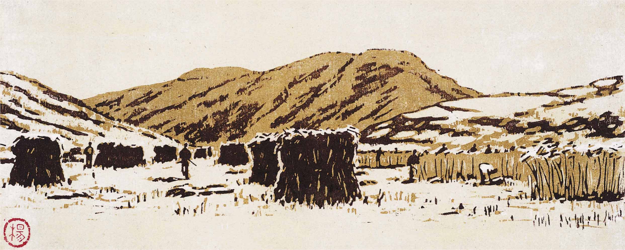 延安组画:糜子丰收|1956年|木版油印套色|12cm×30.4cm|