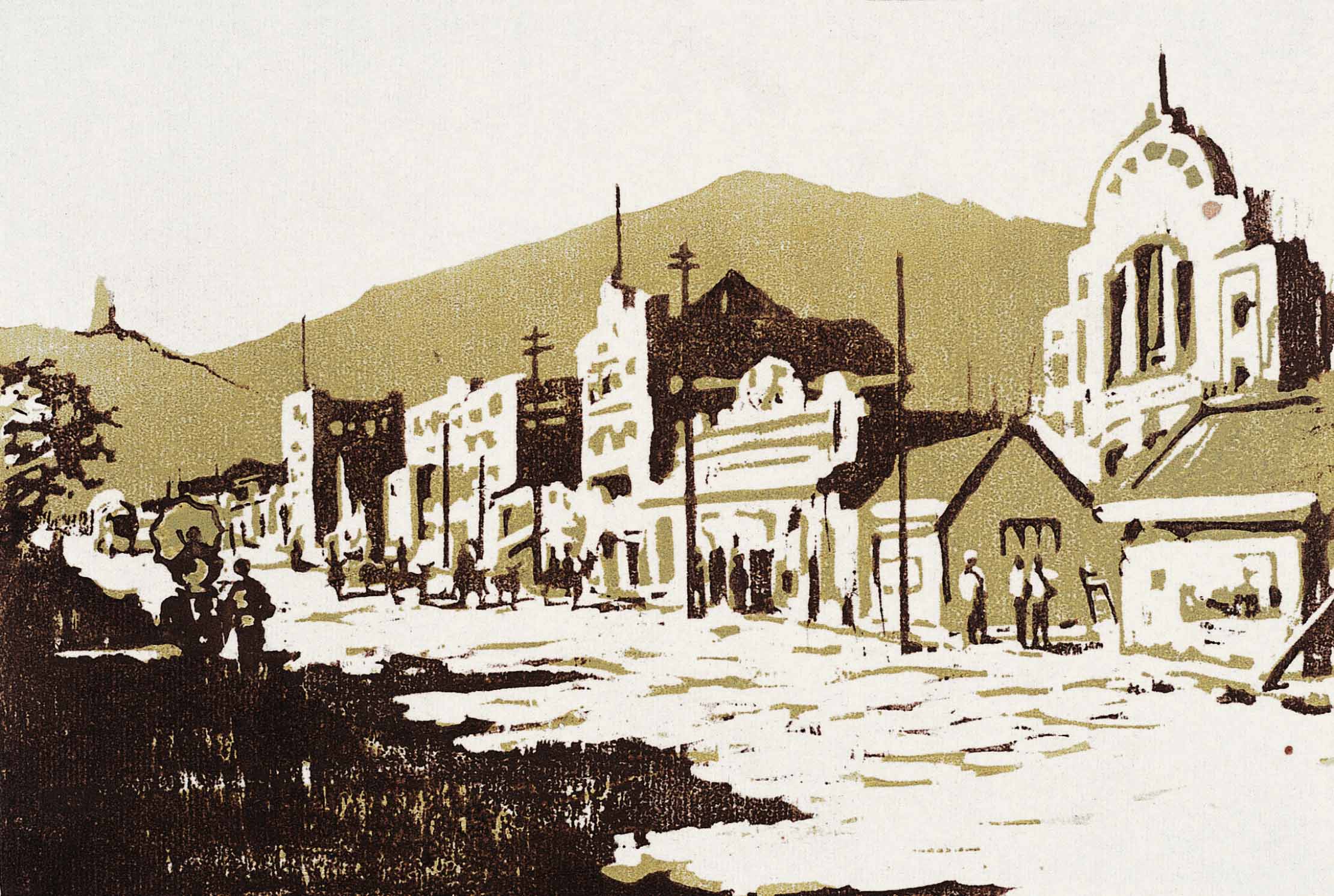 |延安组画:延安大街|1956年|木版油印套色|13.5cm×20.3cm|