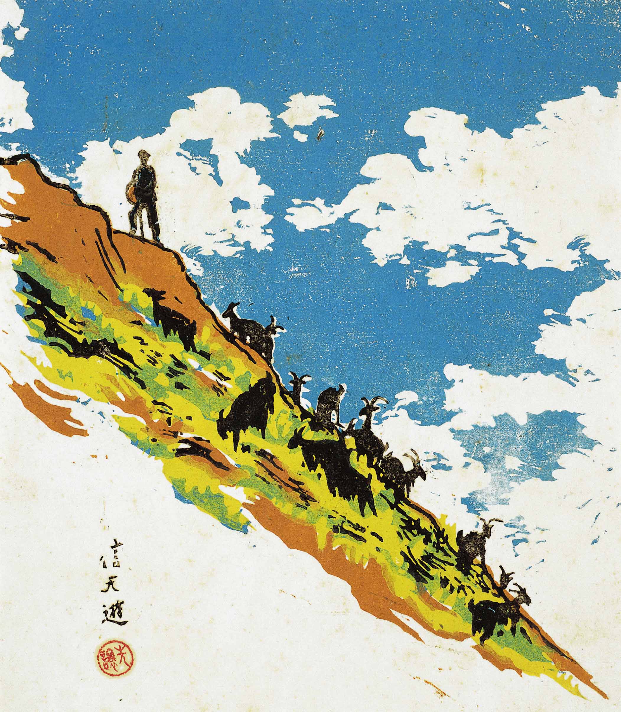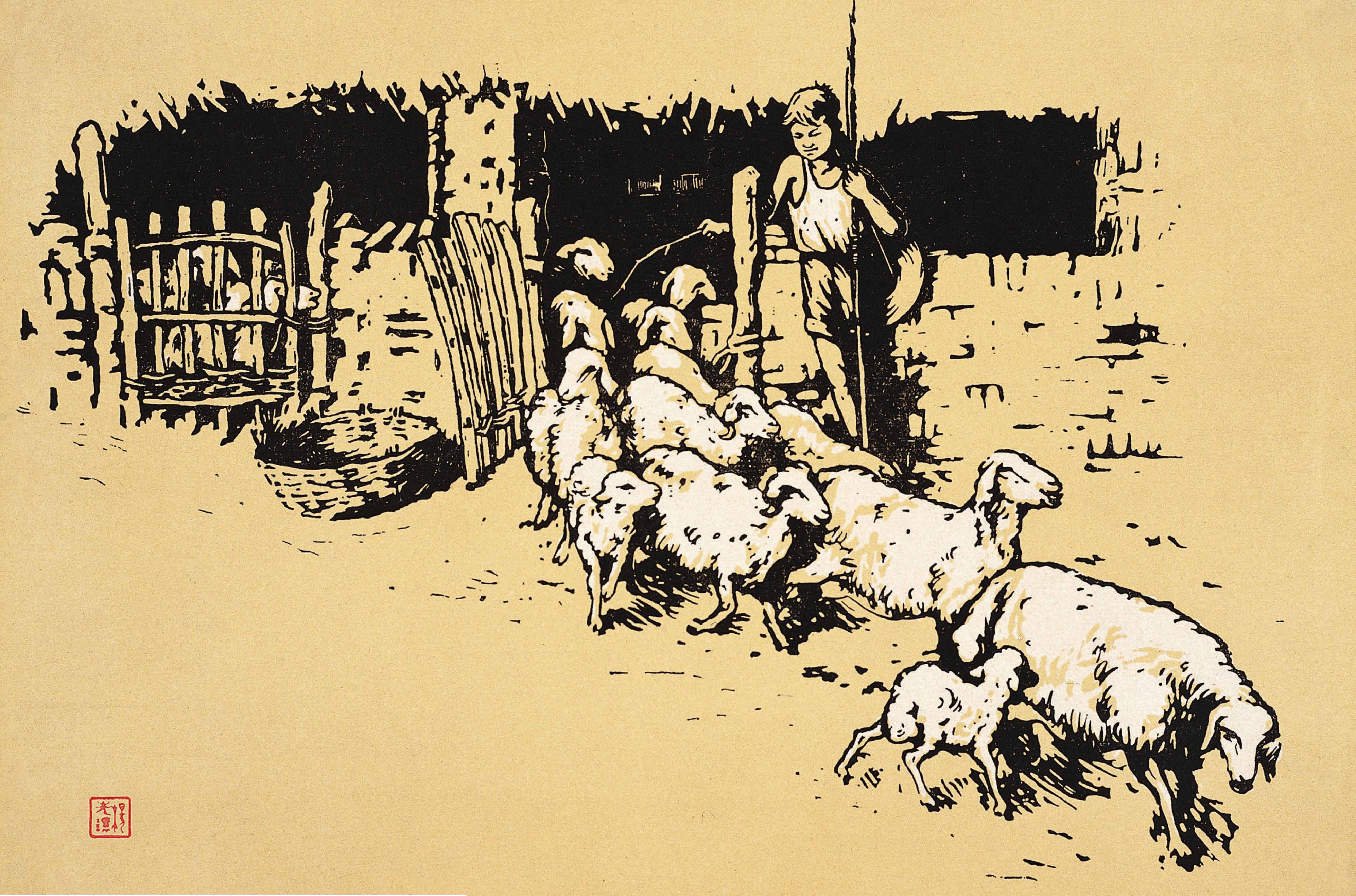 此时,我感到组画中一幅放羊娃等待群羊出圈画面,从黑白效果看,很适合刻一幅木刻版画。记不得怎么弄了几把木刻刀(主要有小、中号圆刀),室领导邹雅从荣宝斋(当年荣宝斋由人民美术出版社领导)给我弄来一小块梨木板子,我既没有请教谁,也没有人来指导我,就这样刻了起来。安靖由美术印刷厂给我弄来点印刷油墨(当年美术印刷厂也由人美社领导)。就这样,我完成了第一幅木刻版画,而且我还套了一版土黄色。未料编辑室将它发稿印成了独幅画。第二年,它在全国青年美展上又获了奖,各报刊发表,尤其是在《人民画报》上转载。《人民画报》主编是丁聪,他见了我说:“你好聪明,木刻版画刻得好。”(当年《人民画报》社也属人美社领导)就这样我是真糊里糊涂走上了木刻版画这条路了。那是我无论如何料想不到的。