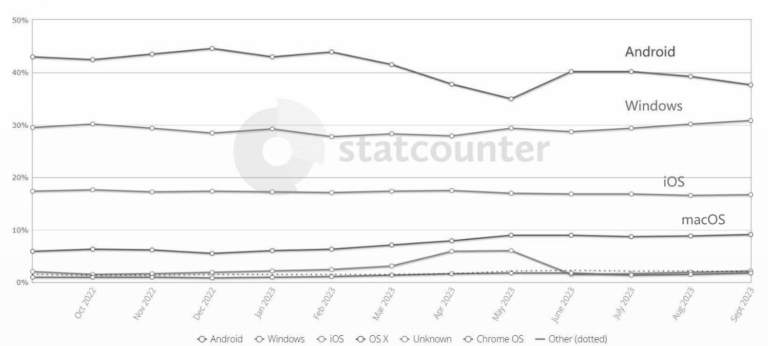 图1-2 各操作系统的市场占有率(2022年9月—2023年9月)