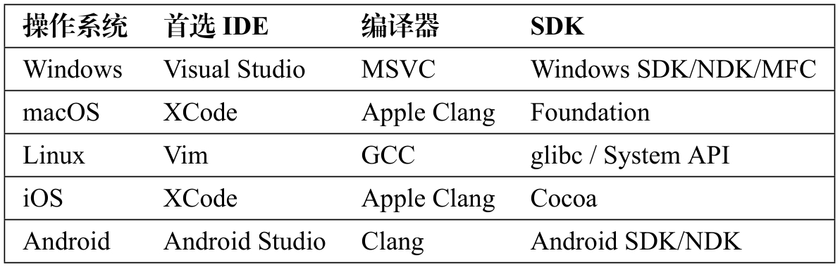 对程序员而言,不同的操作系统对应着不同的首选IDE、编译器和SDK(Software Development Kit,软件开发包),如表1-1所示。