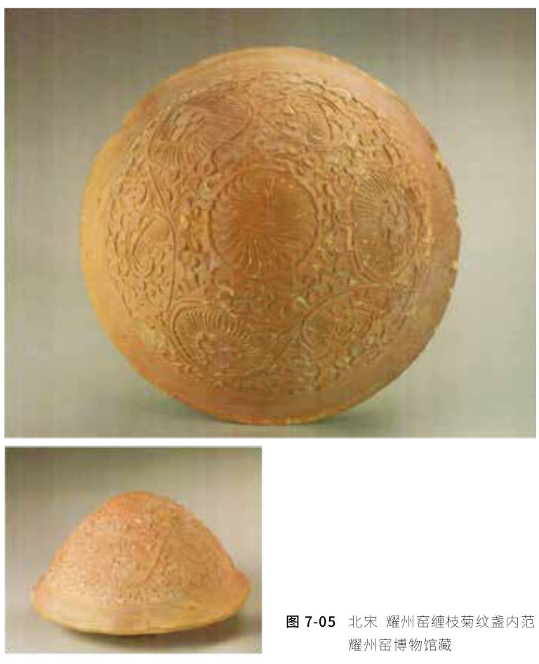 与刻花工艺一样流行的,还有印花工艺。印花的制作,不仅使装饰工艺变得简捷、快速,而且大大增加了纹样图案的丰富和多样性,使得耀州窑青瓷的流布范围快速扩大,对耀州窑系的形成起了推动作用。这件青釉印花碗,与制作它的模子比照,可以使我们对印花工艺有更真切地了解。可以看出,印花图案的结构规整而丰满,讲究对称。虽为模印,却也有线、面、体的变化,施以一层青色釉,更有深浅浓淡的效果,在装饰风格上与刻花有着异曲同工之妙(图7-04)(图7-05)。