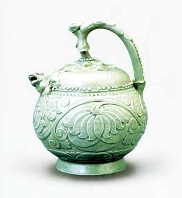 宋代是耀州窑最为鼎盛的时期,从原料配置到制作工艺再到窑炉结构等工艺流程,在当时都属先进行列。最值得称道的是装饰工艺,其独具特色的刻花和印花,被后人誉为“宋代青瓷刻花之最”。《德应侯碑》生动形象地表述了耀州窑的生产过程和产品特色;而大量考古发掘及传世品也印证了碑文所言不虚。北宋早期,耀州窑延续烧造五代时独创的天青釉产品,并受越窑影响,增添了独具特色的剔花工艺(如耀州窑青釉剔花牡丹纹倒装壶)。所谓剔花,是采用比刻花更深的偏刀深挖法,先在坯体上划出纹饰轮廓,然后用刀将花纹以外的地子削掉,形成一个明显的斜面,又称“减地”装饰,由此形成的反差使花纹呈现微微凸起的浅浮雕效果,花蕊、叶脉等细节则采用划花技法,用浅细的阴刻线来表现。两种刀法深浅有致,刚柔相济,装饰效果极佳。这件北宋早期的青釉剔花牡丹纹倒装壶就是非常典型的例子。壶身整体呈圆形,壶顶与提梁衔接,提梁巧妙设计成一只展翅欲飞的凤凰,美观而实用。壶腹剔刻一周牡丹纹,犀利的刀法、流畅的线条,使得牡丹有了灵动的艺术效果。最下层饰一圈仰莲纹,整体构图饱满。壶流塑造了一对母子蹲狮,母狮引颈抬头,利齿外露,做警惕状,四肢骨骼肌肉强劲,有一种不言而喻的气势与威严感,护卫着怀中吸吮乳汁的幼狮,生动逼真。