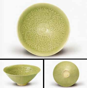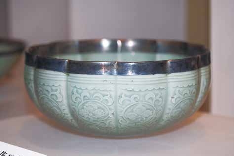 陕西历史博物馆所藏青釉刻花葵口钵,葵口镶银扣,十二曲出筋,深弧腹,内凹底,卧足无釉。钵内壁以及内底都刻有折枝牡丹纹,外壁是缠枝牡丹纹,釉色明亮,给人富贵华丽之感。是目前所知的全球唯一孤品。