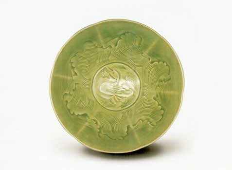 北宋中期以后,一种新的刻花装饰手法在耀州窑兴起。它不同于“减地”,而采用“半刀泥”的技法,行刀较浅,刻与篦划结合,图案线条更具宽窄粗细的变化,辅之以青绿莹润又具玻璃质感的釉层,使得装饰的花纹得以清晰地表现出来。如故宫博物院所藏青釉刻花水波游鸭纹碗,碗呈六瓣花式,青绿的釉色泛着一层莹润光泽。碗心采用刻花与篦划结合的装饰手法,使游鸭与水波纹具备了强烈的动感,与六道凸起的棱线完美结合,令画面具有呼之欲出的生动效果。