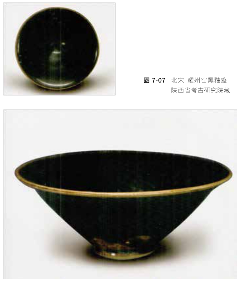 北宋中晚期自上而下风靡斗茶,因白色茶沫配以黑色茶盏更显黑白分明,所以以福建建窑为代表的黑釉茶盏颇为盛行,引得南北众多窑口竞相仿制。耀州窑的这类黑釉盏即是其中之一。陕西省考古研究院所藏敞口黑釉盏,内外壁通施黑釉,釉面光洁明亮,有银灰色油滴状斑痕。胎质坚硬细密,具备典型的耀州窑胎釉特征,其浑朴之感不亚于建窑黑盏(图7-07)。
