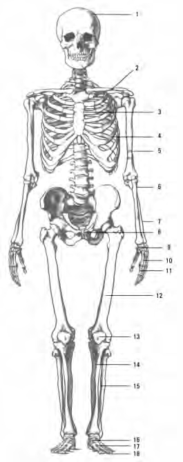每一个成年人全身有206块骨骼(青少年在骨化完成以前,骨的数目多于成年人),其中多数是成对的,总体分颅骨、躯干骨和四肢骨三部分。骨与骨之间借助软骨、韧带或关节连接起来。