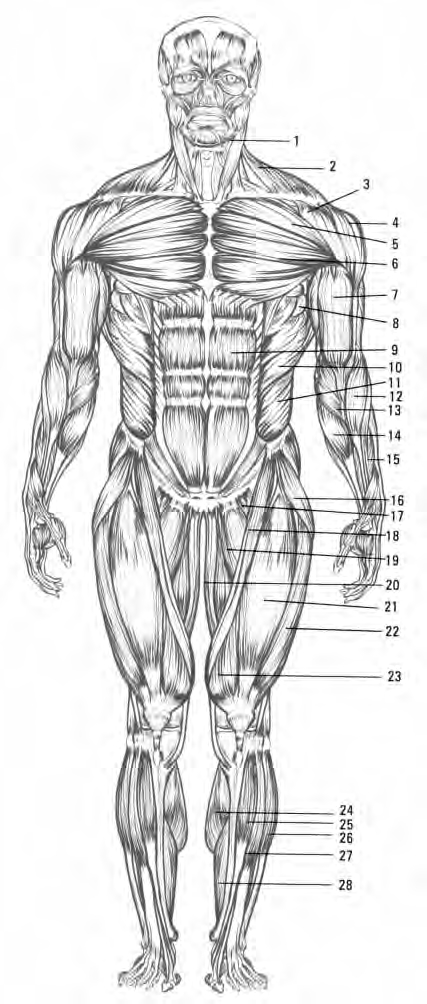 人体肌肉主要分布于躯干和四肢,一般都附着于骨上,故称之为骨骼肌。骨骼肌多数对称分布,在健美健身运动中经常提及的仅六七十对。