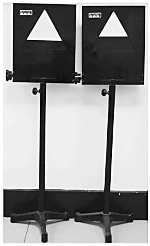 1.选择长度为7m以上的教室。实验时,标准刺激距被试依次为6m、5m、4m、3m、2m、1m。被试间可以采用“先远后近”或“先近后远”的顺序进行实验,每做完一种距离,改换三角形的面积,休息2分钟。