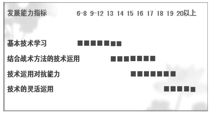 随着年龄的增长和身体发育的不断完善,女子足球运动员技能的发展也呈现出阶段性的特征。首先进行基本技术学习,其次是结合战术方法的技术运用阶段,最后就是技术运用对抗能力和灵活运用阶段。具体时间段见图 2-7。