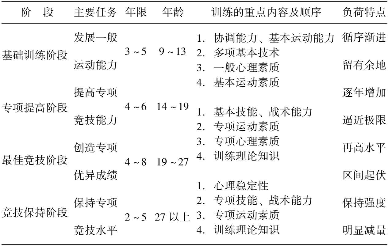 在女子足球运动全程性多年训练过程中,必须根据不同的阶段来安排训练任务、训练内容和训练负荷,并且在不同的训练阶段应该有明确的发展重点。同时在不同的训练阶段,根据不同的训练任务对运动员竞技能力发展水平提出不同的要求。