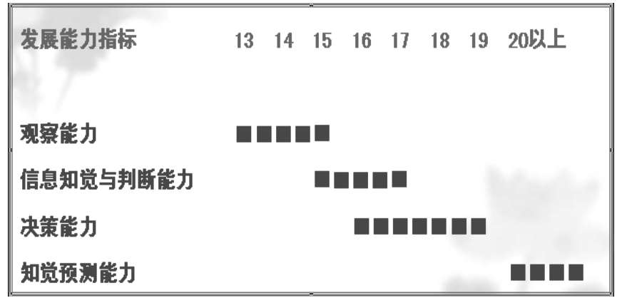 在女子足球运动员战术意识的四个构成要素中,首先能够发展的是观察能力,其次是信息知觉与判断能力,最后依次是决策能力和知觉预测能力。具体年龄段见图 2-8。