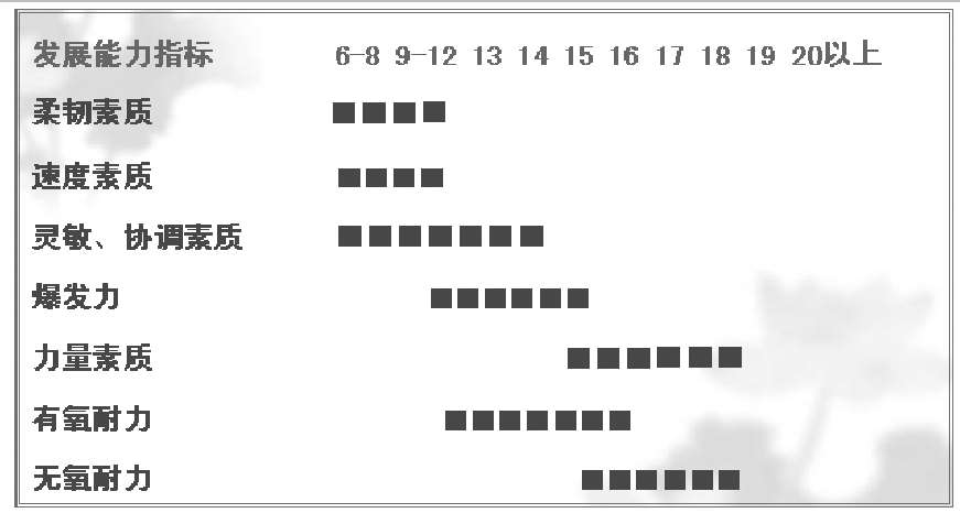 在女子足球运动员体能的各项素质中最先发展的是柔韧、速度、灵敏和协调素质,其次是爆发力和有氧耐力,最后发展的是力量和无氧耐力素质。具体时间段见图 2-6。