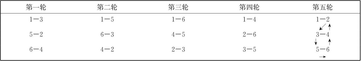 若参赛者为双数,一般都采用此法来编排各轮的比赛。如6队参加比赛,先选出1、2、3、4、5、6个位置号(序号),其第一轮比赛先将1、2、3号自上而下依次写在左侧,再将4、5、6号自下而上与3、2、1号对应写在右侧,然后用横线分别将左右两个对着的号码连接起来,即为第一轮的比赛顺序(表3-1)。将第一轮比赛表中的1号固定不动,其余号码按逆时针方向(如箭头所示)轮转一个位置,即为第二轮比赛秩序,以后各轮次比赛秩序以此类推。