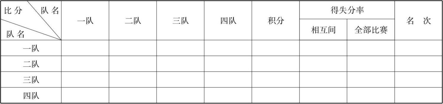 比赛成绩记录表的内容有比赛单位名称、比分(双方比赛结果)、积分、积分相等时排定名次的方法、名次(表3-9)等。体育竞赛项目众多,计算成绩的方法也各不相同,但都必须在竞赛规程中将计分方法、确定名次的方法做明确的规定。特别是要把在有多个参赛者积分相同的情况下如何最后确定名次的方法说明清楚。