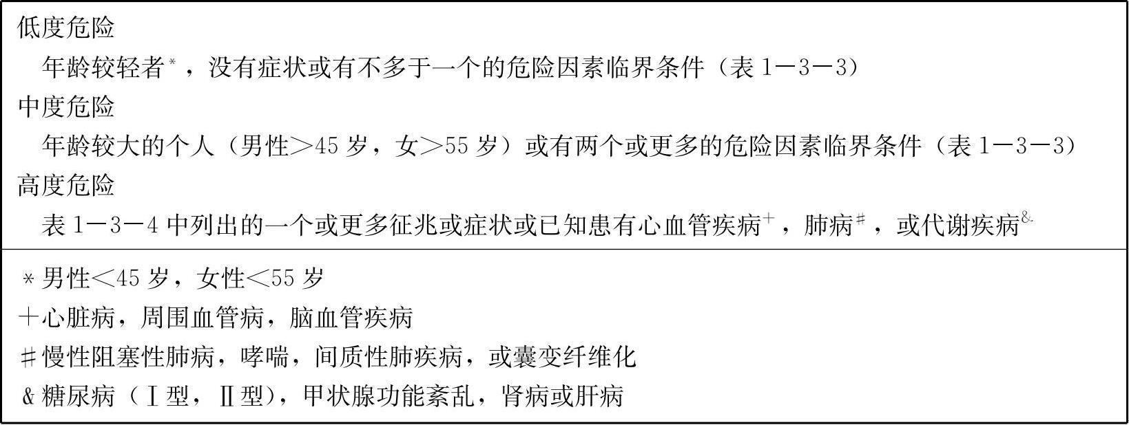 注意:表1-3-3中的冠状动脉疾病危险因素临界条件与美国心脏协会给出的心血管疾病的主要危险因素不同(即,高血压,高胆固醇血症,吸烟,不运动)。ACSM冠状动脉疾病的危险因素临界条件的意图是为了危险分级,即考虑医生评估和进行体疗康复的必要,也进行训练测试所需要的医务监督。