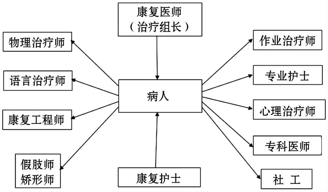 康复医学专业人员互相配合,完成对病人的康复工作。其康复协作组形式如图1-4-1。