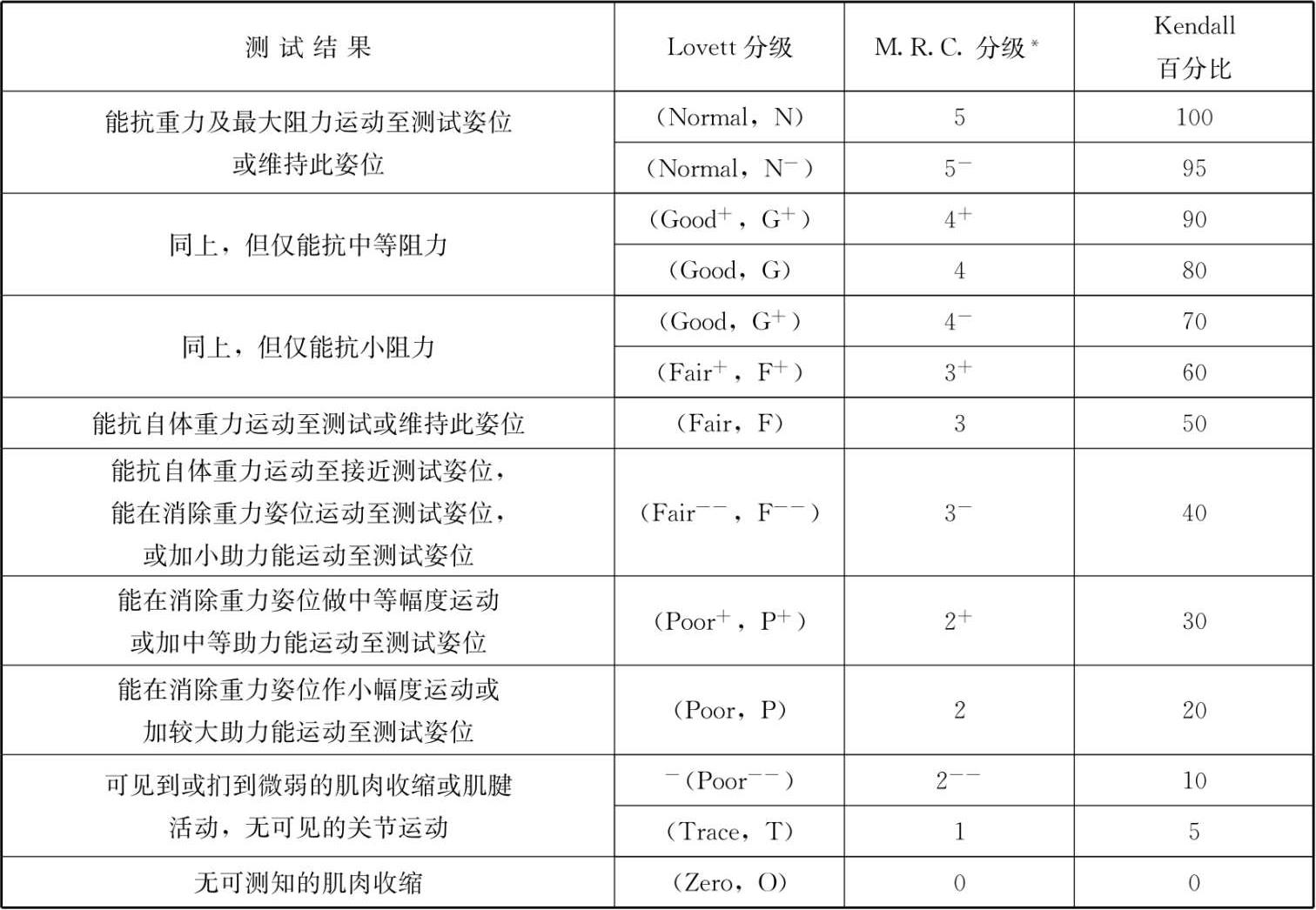 手法肌力检查通常采用Lovett的6级肌力分级法。其中3级是手法肌力检查的中心,即以各肌肉能否抵抗所在肢段的重力而达到正常活动范围作为3级肌力的标准。各肌力的具体分级标准见表2-1-1。