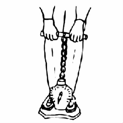 测试时两膝伸直,将把手调至膝盖高度,两手抓住把手,然后伸腰用力上拉把手(图2-1-3)。进行背拉力测试时,腰椎应力大幅度增加,易引起腰痛发作,故不适用于腰痛患者及老年人。