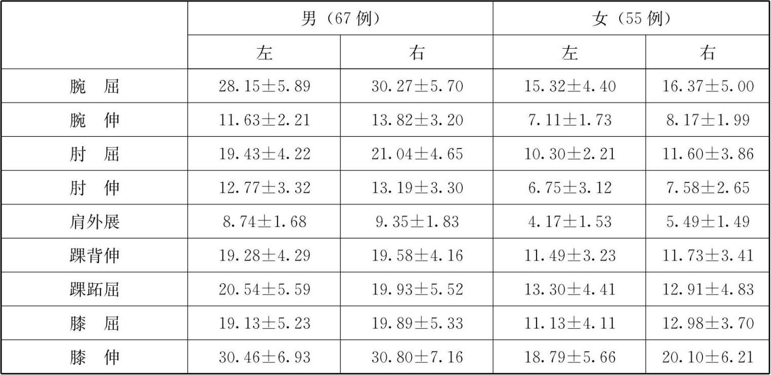 正常中青年成人的四肢等长肌力测试结果见表2-1-2。
