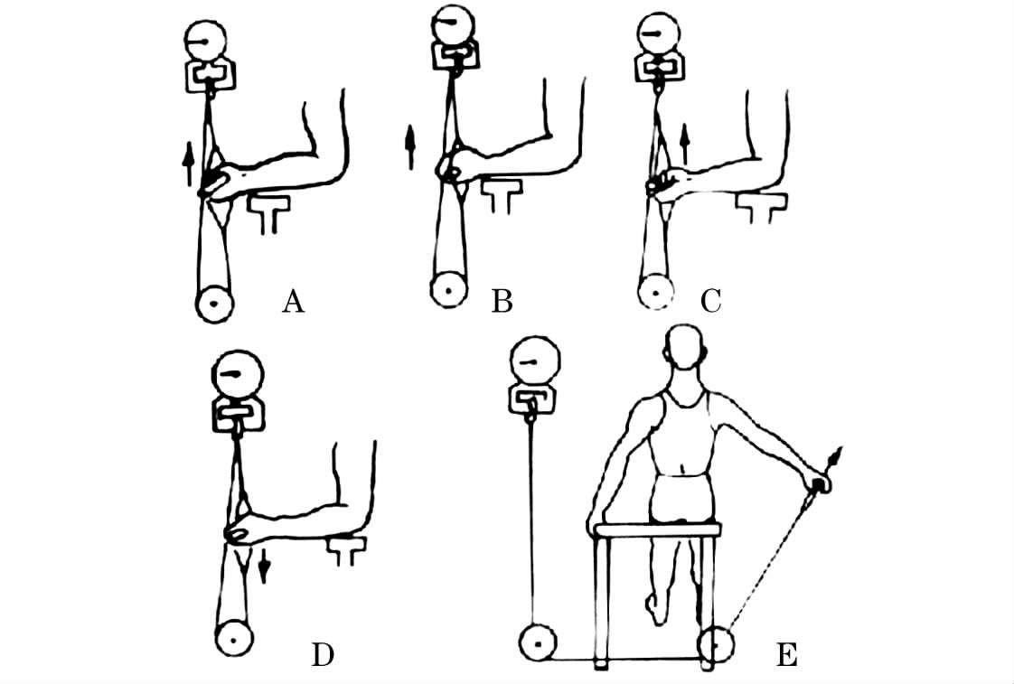 在标准姿势下通过钢丝绳与滑车装置牵拉固定的测力计,可测试四肢各组肌群(如腕、肩、踝的屈伸肌群及肩外展肌群)的肌力(图2-1-4,2-1-5)。
