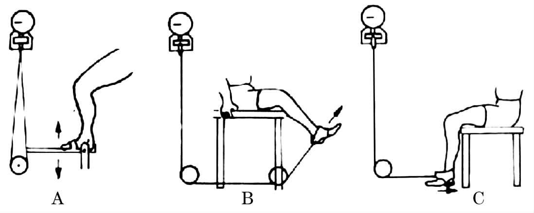 A、踝屈伸肌力(踝中立位)B、伸膝肌力(膝屈45°)C、屈膝肌力(膝屈90°)