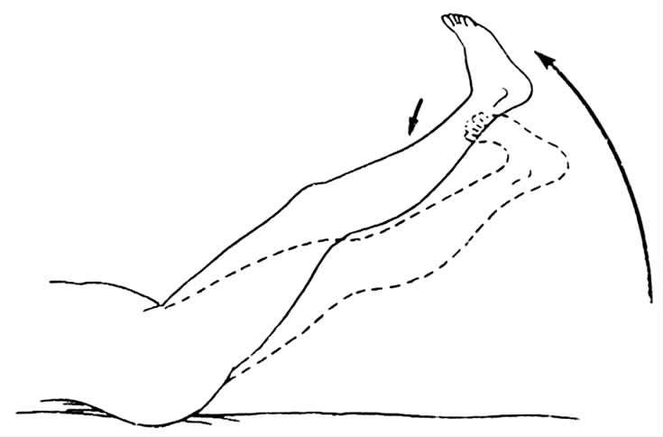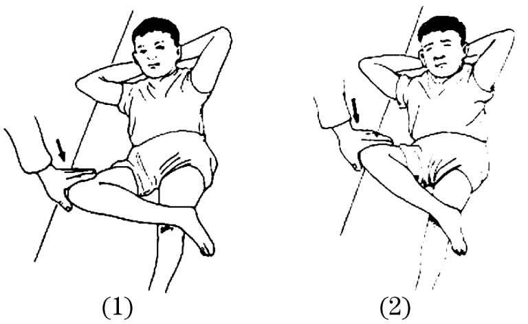 患者仰卧,检查者一手握小腿踝部,另一手扶住膝部将髋与膝屈曲,使小腿外展外旋,然后逐渐将膝关节伸直。如引起内侧疼痛或响声即为阳性,表示内侧半月板损伤;如将小腿内收内旋,并将膝关节伸直,引起外侧疼痛或响声者,亦为阳性,表示外侧半月板损伤。