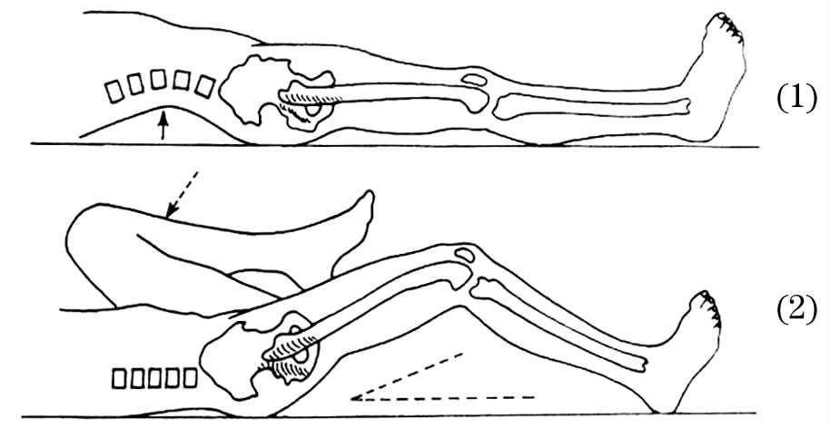 用于测试髋的屈曲畸形。测试方法的原则是腰椎需平放于床上,消除腰椎的代偿功能,使髋关节的畸形毕露,并能测量髋的屈曲畸形度,以及存在的内旋或内收畸形度。患者仰卧于硬板床上,将健侧髋、膝关节完全屈曲,使膝部贴住或尽可能贴近前胸,此时,腰椎前凸完全消失而腰背平贴于床面,若患髋存在屈曲畸形,即能一目了然,根据大腿与桌面所成之角度,判定屈曲畸形为多少。(图2-2-3)。