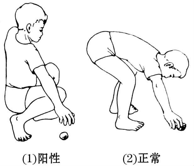 患者拾取地上物件时,仅屈膝、屈髋,而腰挺直不能弯曲者为阳性(检查脊柱有无弯曲运动障碍)(图2-2-1)。