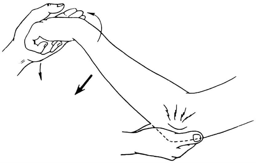 肘关节伸直,前臂旋前位,将腕关节掌屈,引起肱骨外上髁处疼痛者为阳性。见于肱骨外上髁炎(图2-2-9)。