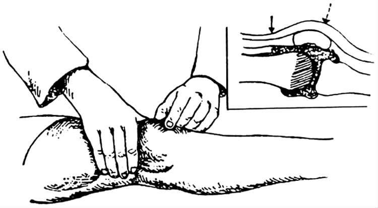平卧位患膝伸直,放松股四头肌,检查者一手放在髌骨上方下压,另一手的手指按压髌骨,感到骨碰击或压力放松时手指感觉髌骨自然浮起者为阳性(表示膝关节内有积液)(图2-2-7)。