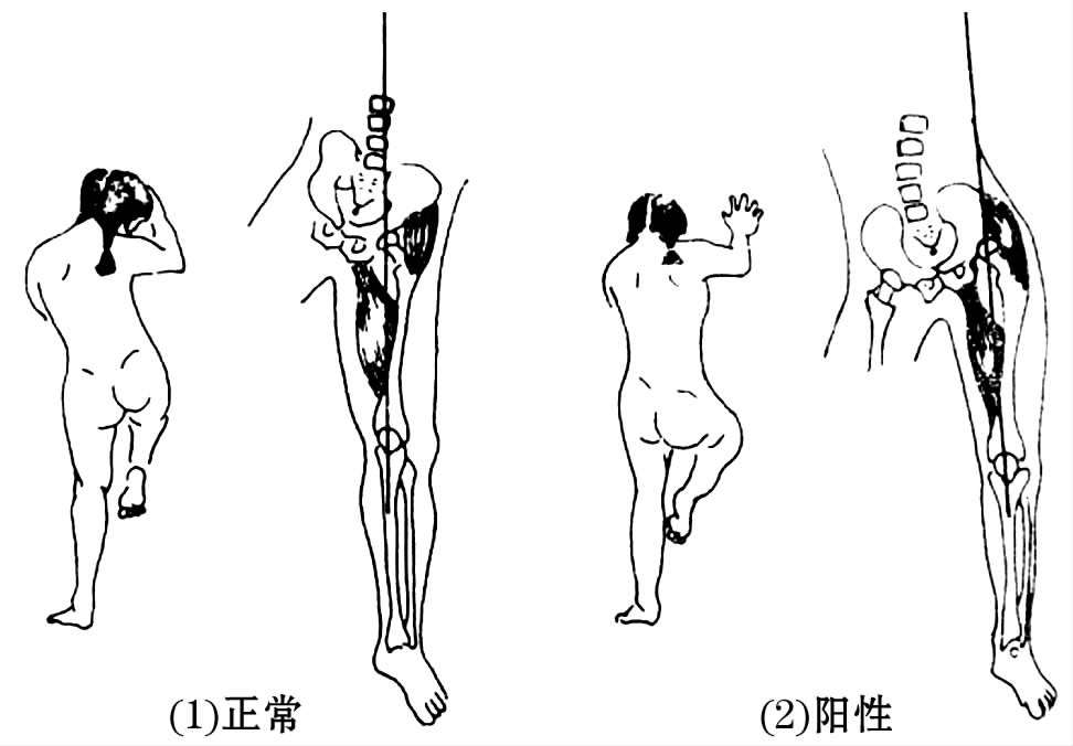 患者站立,患侧下肢负重,健侧腿提起,髋膝屈曲,观察分健侧臀皱襞,如健侧皱襞随之下垂,躯干向健侧倾斜为阳性(多表示髋关节脱位或臀中肌功能障碍),反之则为阴性(图2-2-5)。