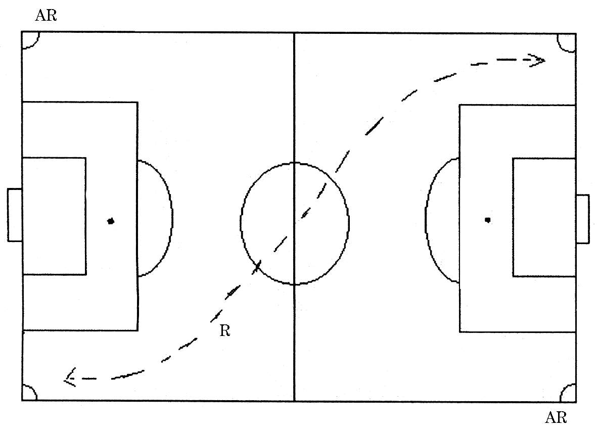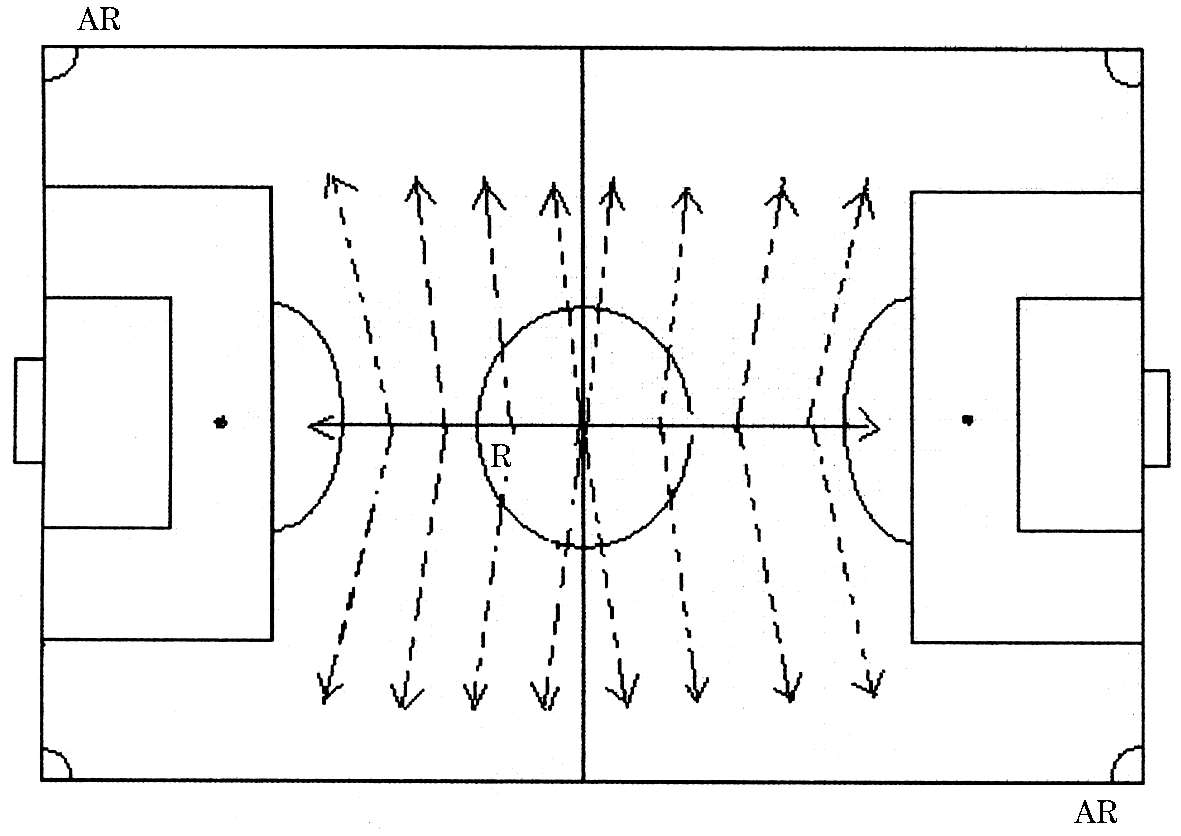 随着足球运动的不断发展,足球裁判员的跑动路线也在不断地发生变化,其目的就是能够更好地适应比赛的需要。到目前为止,裁判员的跑动路线可分为:直线跑、小斜线跑、大斜线跑、小S形跑、大S形跑、鱼刺跑、跟踪跑。