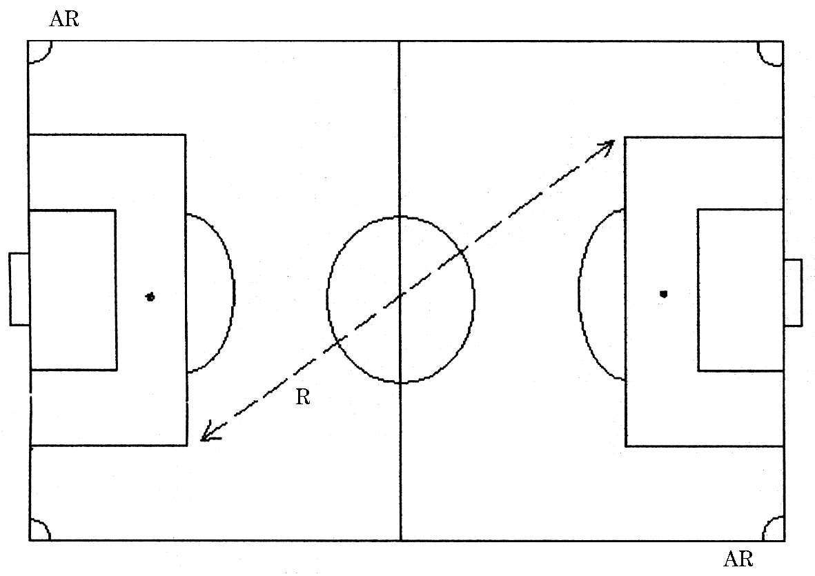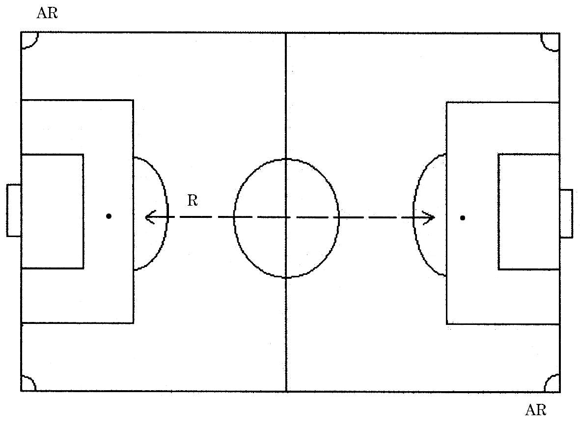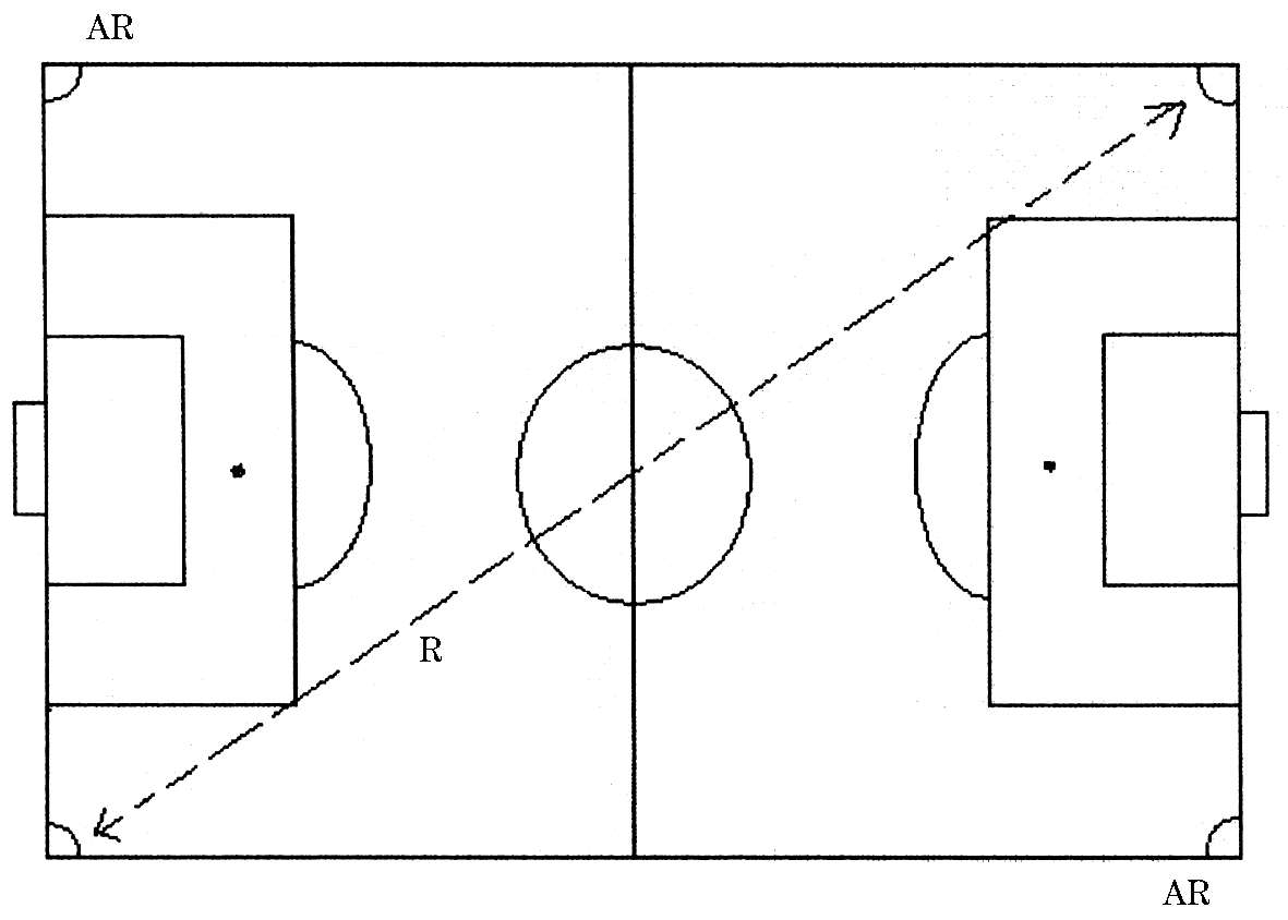 大斜线跑的方法是,以远离助理裁判员一端的两个角旗附近为起、止点,裁判员的活动路线主要集中在这条斜线上。(图 3)