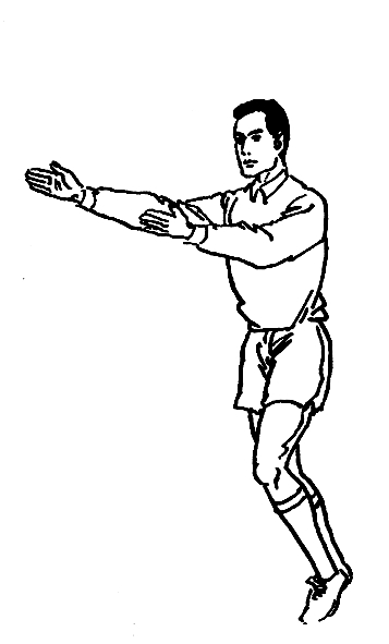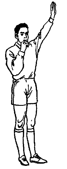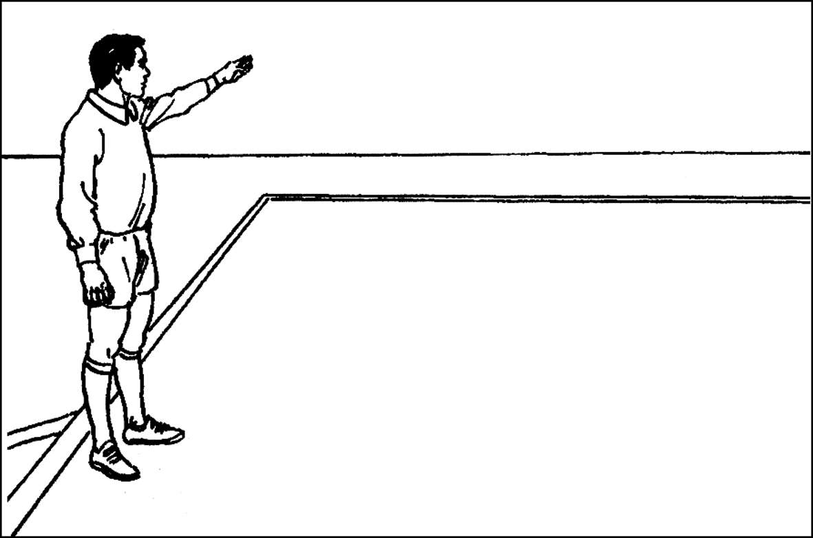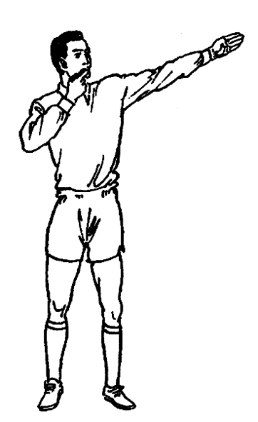 单臂上举,掌心向前。此手势应持续到球踢出后,并被场上其他队员触及或成死球时为止。