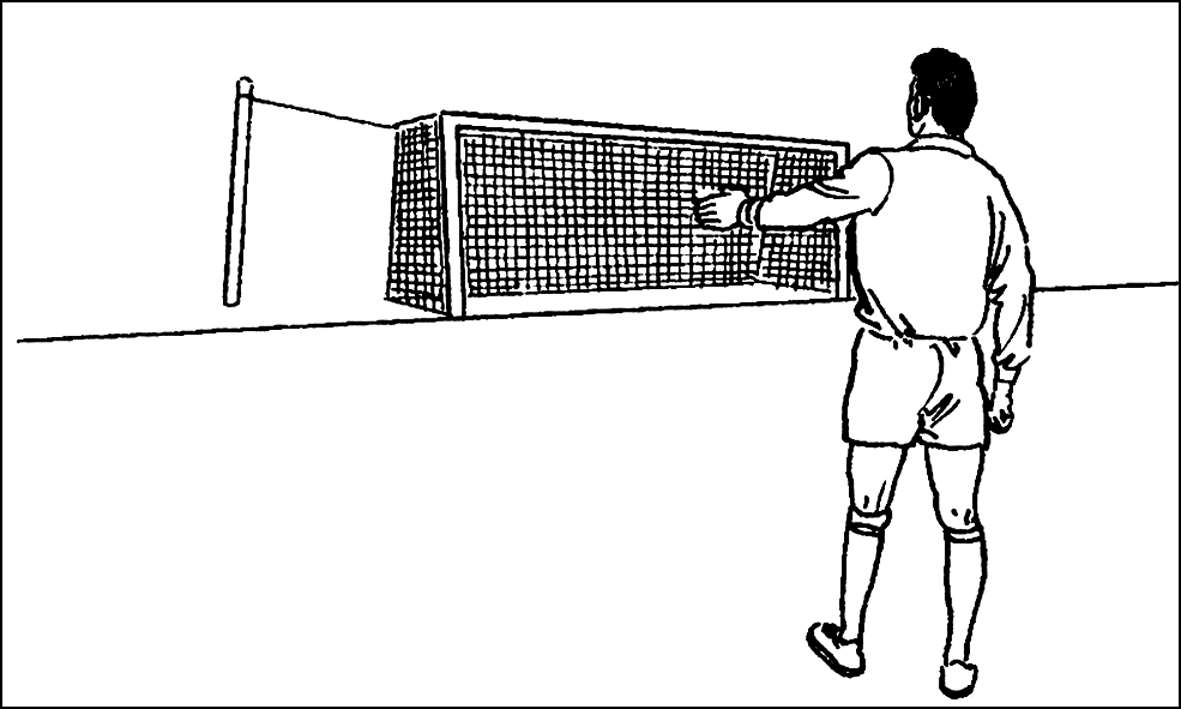 单臂向前斜下举,指向执行球门球的球门区。