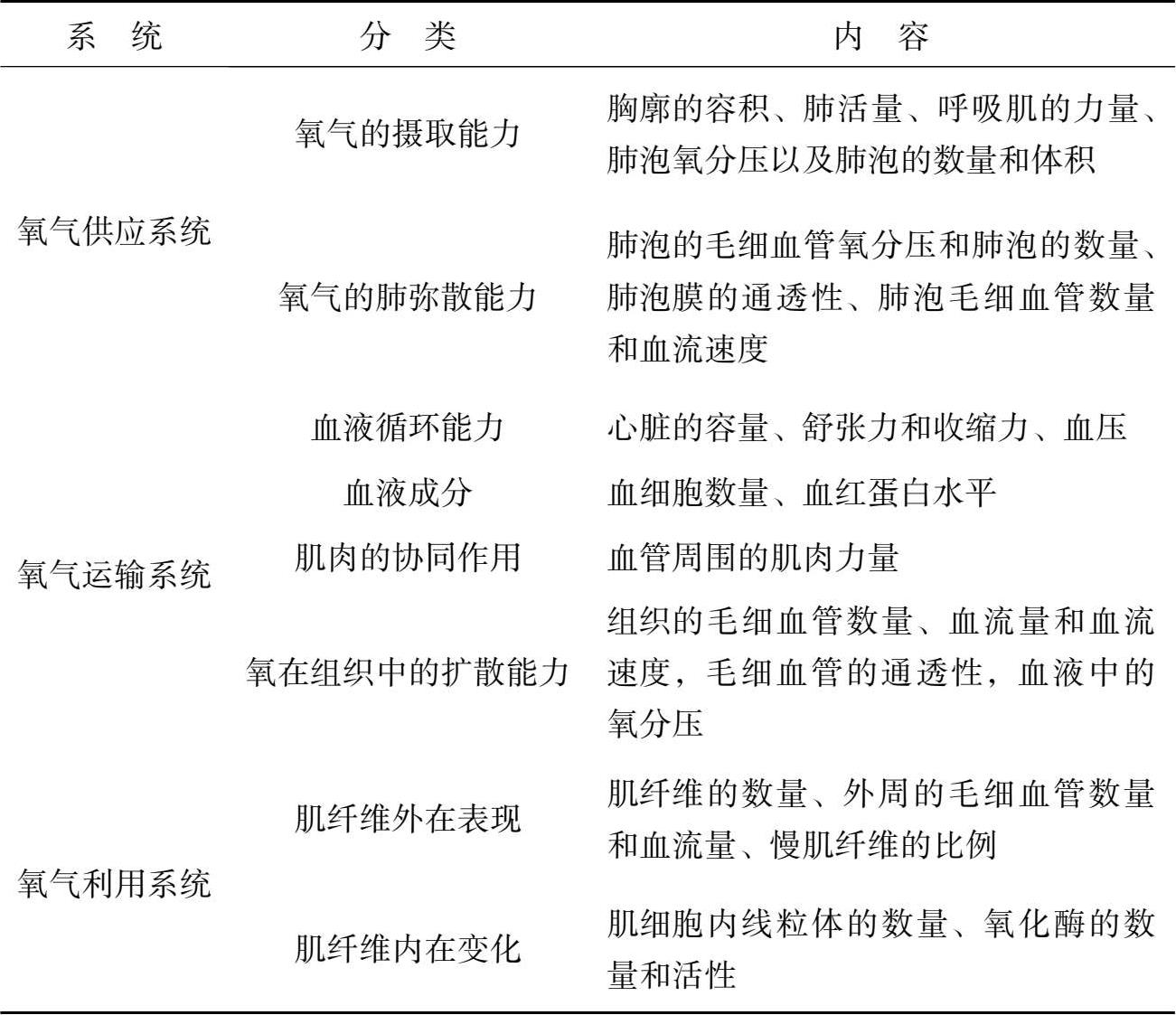 表 2-1-1 影响马拉松运动员有氧代谢能力的氧气供应、运输和利用系统