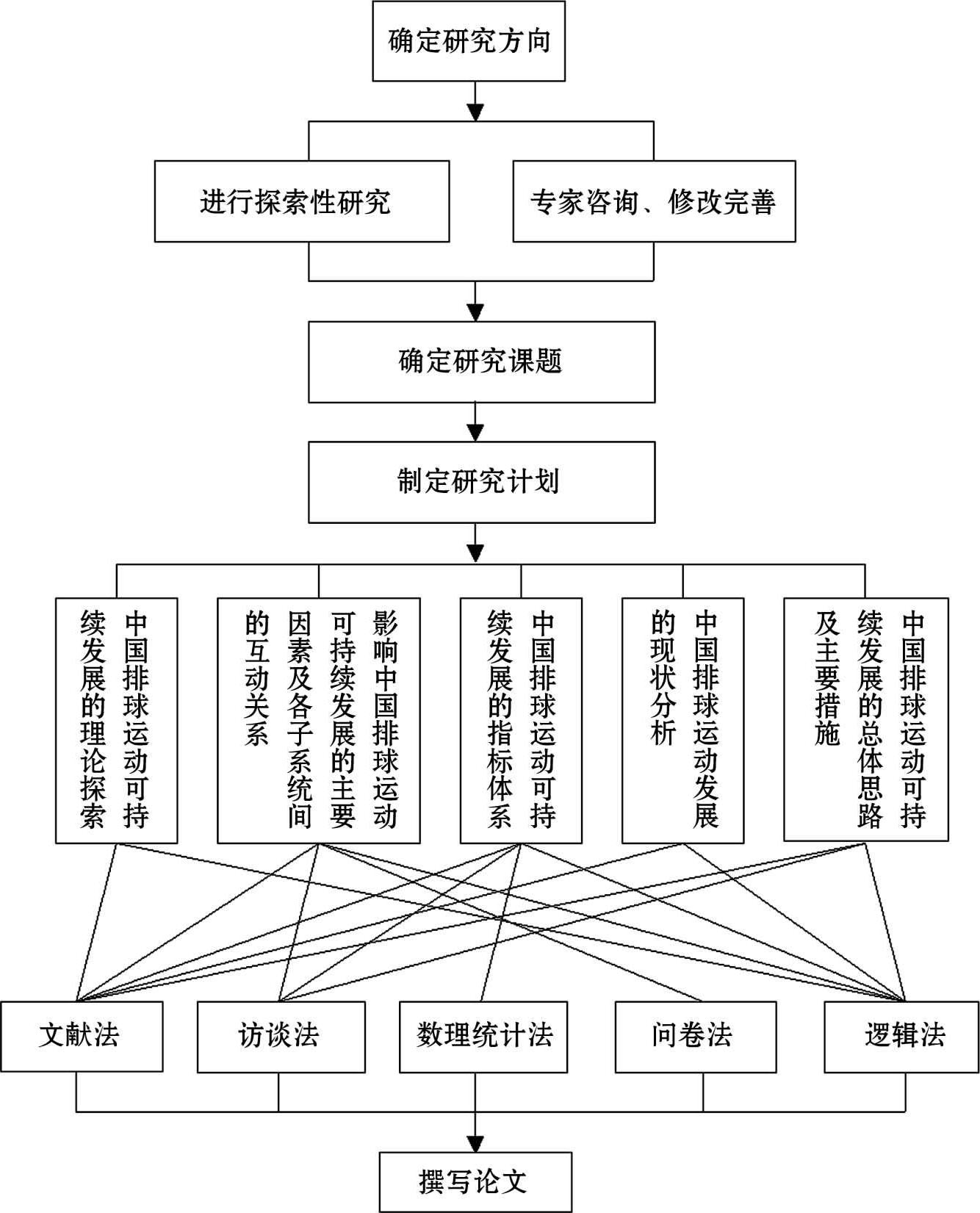 从总体来看,本研究是在相对比较宏观的层面上对中国排球运动可持续发展的理论问题进行探讨和分析,在研究的实施过程中主要采用了文献研究与调查研究相结合的研究方式。其中,对“中国排球运动可持续发展的理论探索”的研究主要以文献研究为主,对“影响中国排球运动可持续发展的主要因素及各子系统间的互动关系”、“中国排球运动可持续发展的指标体系”和“中国排球运动可持续发展的总体思路及措施”的研究则采用了文献研究与调查研究相结合的方式。另外,由于本文的研究对象“中国排球运动”是一个具有一定逻辑层次和结构的复杂系统,而且其本身又处于“社会”这个更大的系统之中,为了更好地认识和把握这些关系复杂的系统,本研究在实施过程中始终坚持了“整体→部分→整体”、“综合→分解→综合”的系统理论的研究和分析方式。